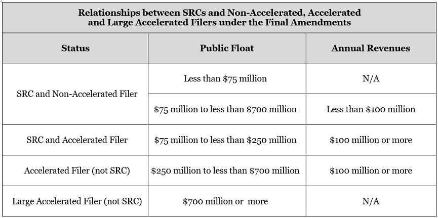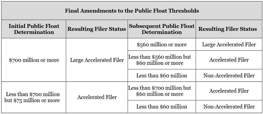 The SEC also amended the transition thresholds for exiting accelerated or large accelerated filer status. Currently, an issuer will remain a large accelerated filer until its public float falls below $500 million, at which time it will become an accelerated filer. The amendments adjust the transition threshold for exiting large accelerated filer status to $560 million to align with the SRC transition threshold. Under the current rules, an issuer that is an accelerated or large accelerated filer will become a non-accelerated filer if its public float falls below $50 million. The amendments adjust the transition threshold for becoming a non-accelerated filer to $60 million. Appendix C includes a table excerpted from the adopting release that outlines the amendments to the public float transition thresholds. The amendments also add the revenue test of the SRC definition as another prong when determining whether an issuer is eligible to exit accelerated or large accelerated filer status.