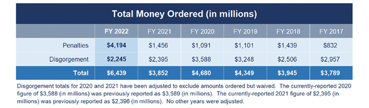 Most notably, the SEC touted a recordbreaking year in monetary recoveries ordered due to a huge increase in penalties. Money ordered in SEC actions totaled over $6.4 billion in civil penalties, disgorgement, and prejudgment interest — the most on record in SEC history and almost $2.6 billion more than was collected in 2021. Of that, civil penalties comprised $4.194 billion, also the highest on record and nearly double the amount collected in disgorgement, which decreased to $2.245 billion in 2022.