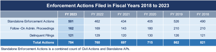 The Division reported that it brought a total of 501 standalone actions, an 8% increase over 2022. The total number of enforcement actions also increased 3% from the prior year at 784 total actions. Although still down from pre-Covid years, the numbers have steadily increased in recent years.