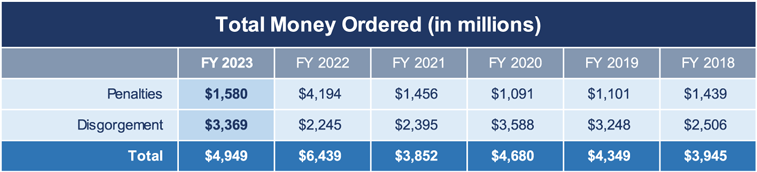 The Division also reported the second highest amount of monetary recoveries in SEC history following record-breaking numbers in 2022, totaling nearly $5 billion in civil penalties, disgorgement, and pre-judgment interest in 2023. Of that, civil penalties comprised $1.580 billion, a large portion of which included combined penalties totaling more than $400 million by 25 investment advisory firms, broker-dealers, and credit rating agencies to settle charges that they violated recordkeeping requirements of the federal securities laws. The amount collected in disgorgement and prejudgment interest in 2023 was $3.369 billion, an increase over the prior two years.