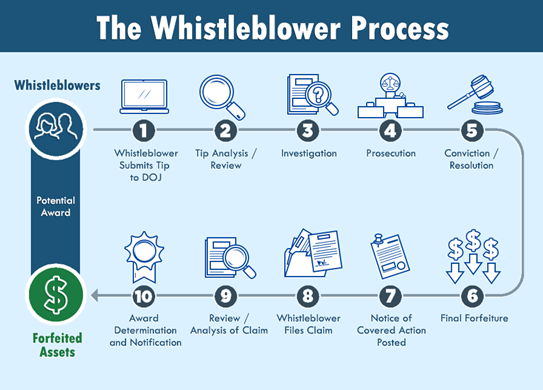 In remarks made on the day of the Whistleblower Program launch, DAG Monaco announced that whistleblowers could now visit the Corporate Division Corporate Whistleblower Awards Pilot Program website to report corporate crimes. The page contains the following image summarizing the whistleblower process in an effort to make the reporting process as user-friendly as possible for potential whistleblowers.