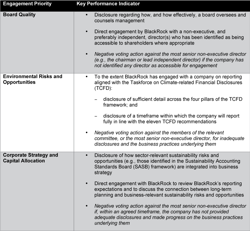 The table below summarizes BlackRock’s new KPIs within each engagement priority and the voting actions BlackRock may take. Companies should review these KPIs and consider them in the context of their broader shareholder engagement strategy, with BlackRock and others, for the 2020 proxy season, and to the extent still possible consider how to address in the proxy statement.