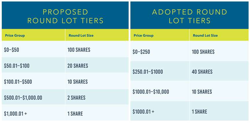 - Round Lot Tiers – The SEC amended the proposed round lot tiers such that most securities will continue to have a round lot of 100 shares (i.e., securities priced between $0 and $250 per share.
