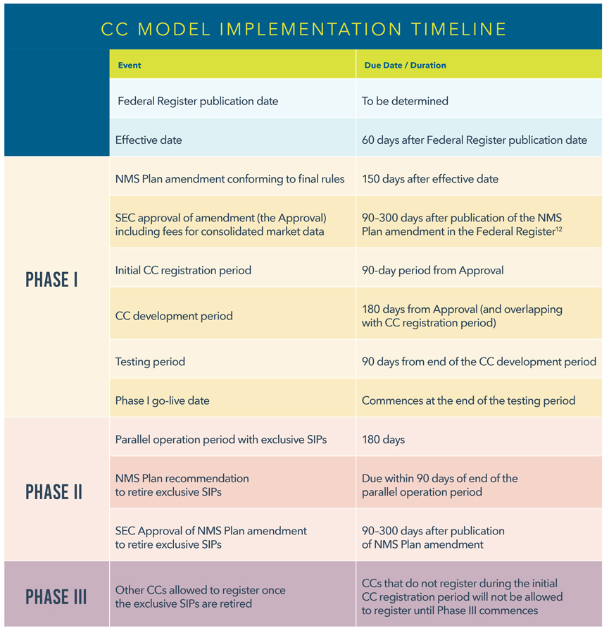 The SEC proposed a lengthy implementation timeframe to facilitate the transition from the exclusive SIPs to competing consolidators, including a period of time during which they will operate in parallel. An overview of the implementation timeline to transition to competing consolidators (CCs) is set forth below.