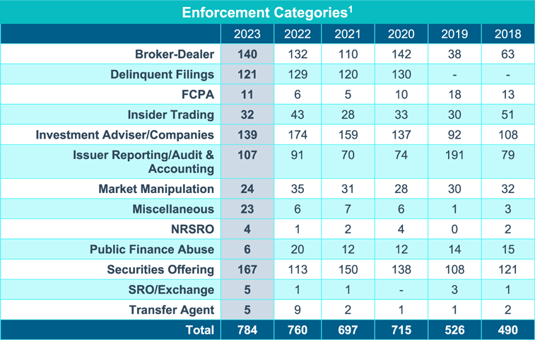 The Division reported that it brought a total of 501 standalone actions, an 8% increase over 2022. The total number of enforcement actions also increased 3% from the prior year at 784 total actions. Although still down from pre-Covid years, the numbers have steadily increased in recent years.